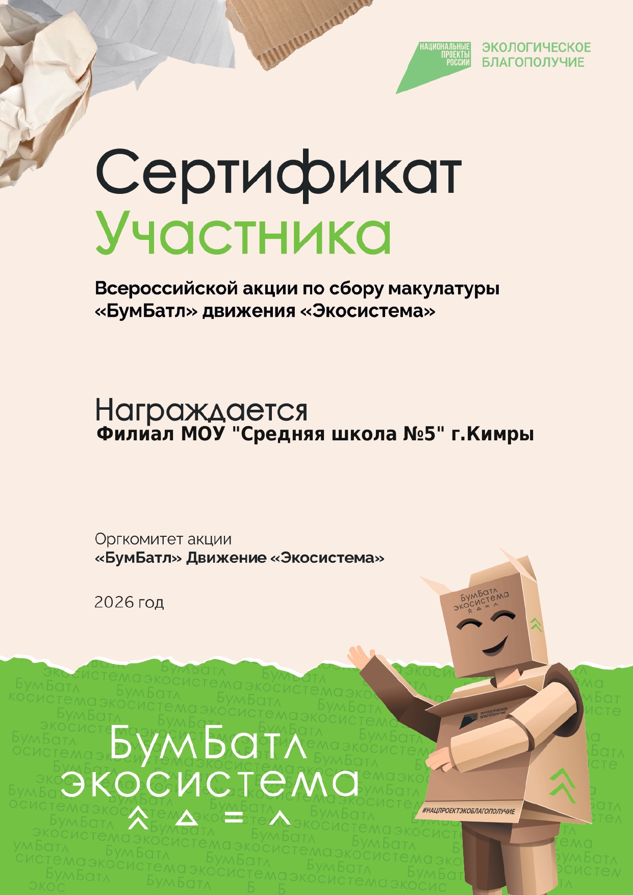 Сегодня проблема окружающей среды в России и во всём мире стоит особенно остро. И для того чтобы сохранить планету для будущих потомков, необходимо каждому человеку с раннего возраста научиться охранять природу. «БумБатл» — это Всероссийская акция по сбору макулатуры в поддержку национального проекта «Экология», который реализуется по решению Президента. Акция проходит под эгидой Всероссийского экологического общественного движения «Экосистема». «БумБатл» дает возможность проявить заботу о природе через сбор и сортировку бумаги. В нашей школе тоже прошла Всероссийская акция по сбору макулатуры «БумБатл». В акцию с большим интересом включились не только дети, но и их родители. Собрали мы 133 кг макулатуры. Предоставляя бумаге новую жизнь, мы вносим неоспоримый вклад в сохранение лесов нашей страны!