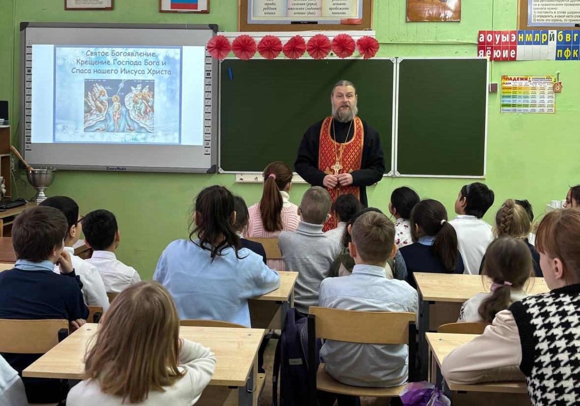 22 января наша школа распахнула двери для особых гостей. Настоятель храма Иоанна Предтечи прот. Владимир Кириллов и педагог воскресной школы храма Кириллова Анастасия Юрьевна приехали в школу, чтобы рассказать о празднике Богоявления Господня и Таинстве Крещения.
