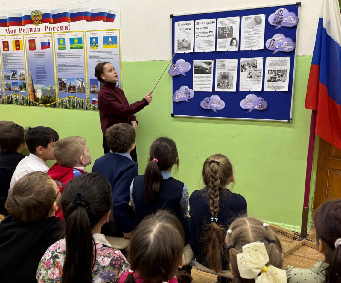 - прошёл урок памяти, посвящённый героической обороне Ленинграда в годы Великой Отечественной войны. Ребята погрузились в историю одного из самых трагических периодов нашей страны — 900‑дневной блокады города;